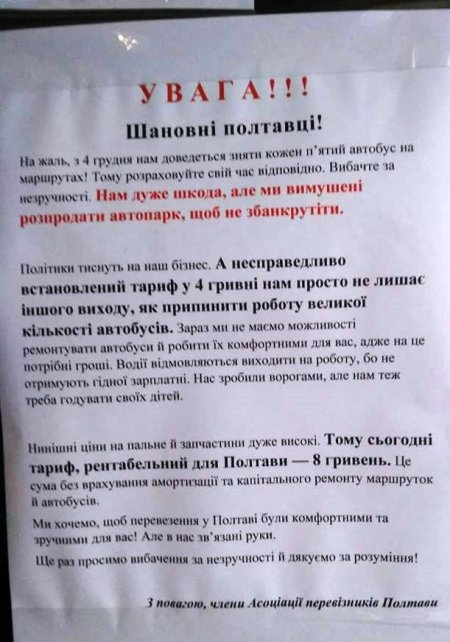 Щоб «пришвидшити» цей процес, маршрутчики вдалися до активних дій: сьогодні, за попередніми обіцянками Асоціації перевізників Полтави, в рейс не пустили кожен 5-тий автобус. Папірці з подібним повідомленням днями з’явилися в міському громадському транспорті.