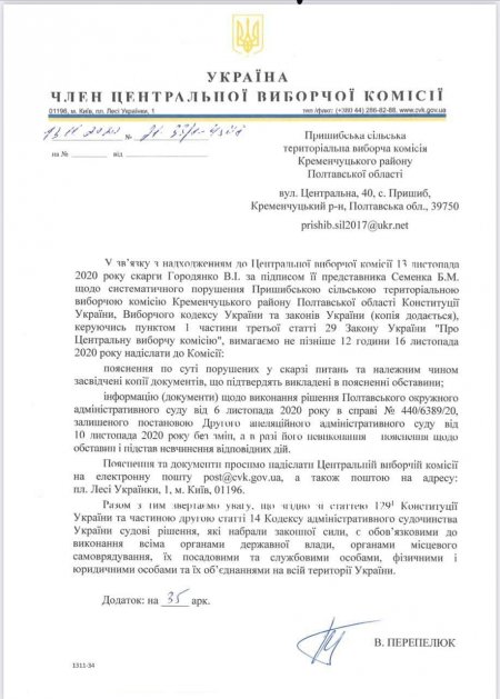 Валентині Городянко довелося поскаржитися до ЦВК на систематичне порушення Пришибським тервиборчкомом Виборчого кодексу та Конституції. ЦВК зобов'язала Пришибську комісію до 12.00 16 листопада надати пояснення, підтверджені документами, щодо виконання рішення суду.