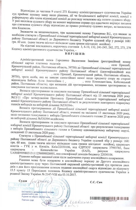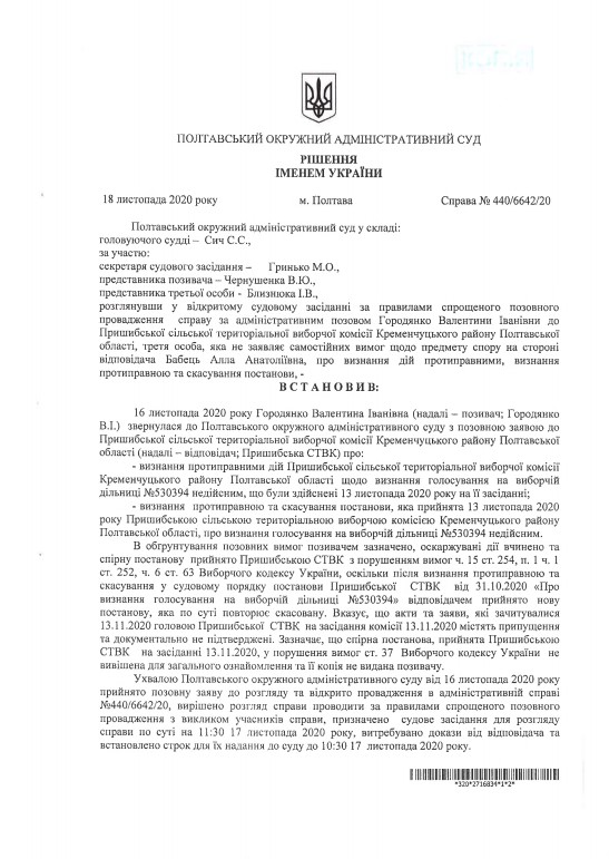 Вчора, 18 листопада, відбулося чергове засідання Полтавського окружного адміністративного суду за адмінпозовом кандидата на посаду Пришибського сільського голови Валентини Городянко до Пришибського сільського тервиборчкому, в якому жінка просила скасувати постанови комісії про визнання голосування на дільниці Кобелячок недійсним та перерахунок голосів.