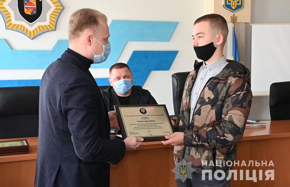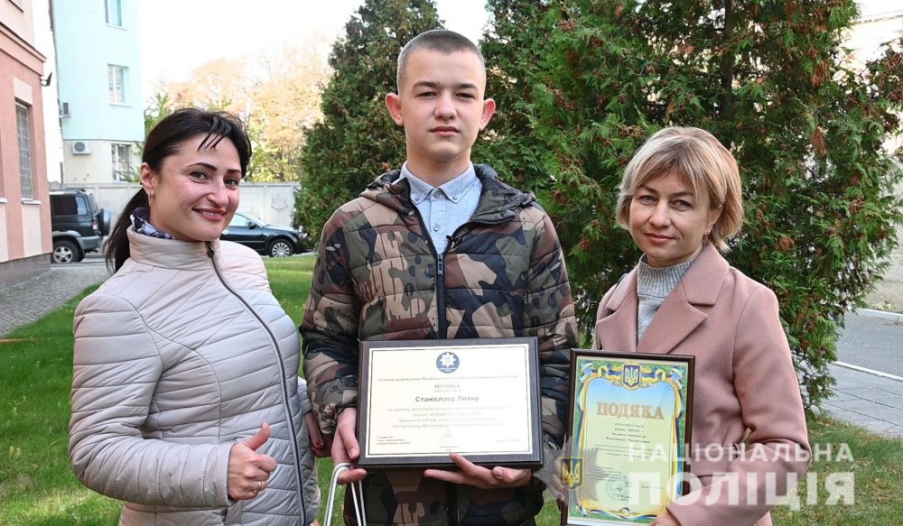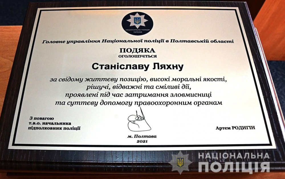 Дев’ятикласник Станіслав Ляхно, учень Полтавської ЗОШ №11, отримав подяку Головного управління Національної поліції в Полтавській області за рішучі та відважні дії, проявлені під час затримання зловмисниці.