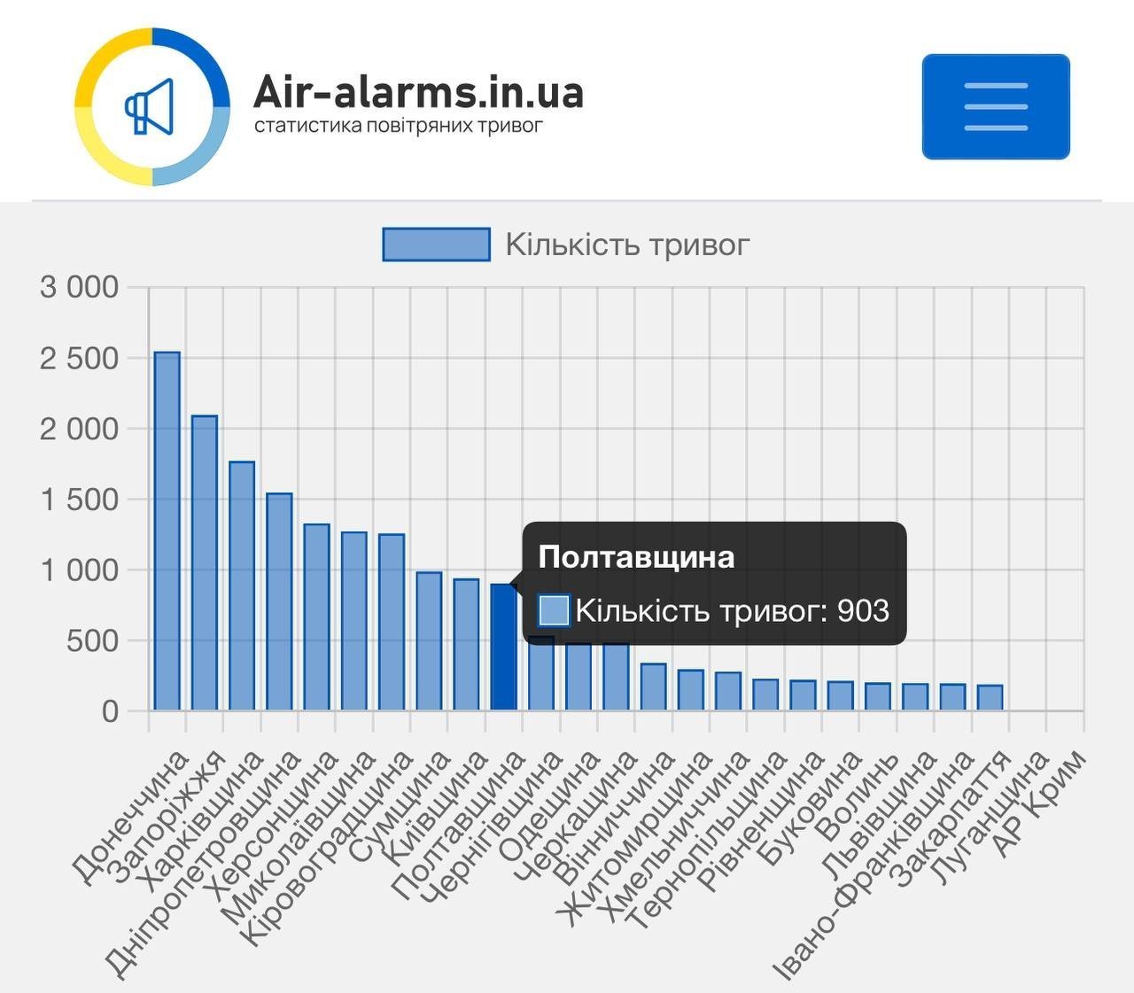 Очолює рейтинг Донецька область — за останній рік там було понад 2,5 тисячі повітряних тривог.