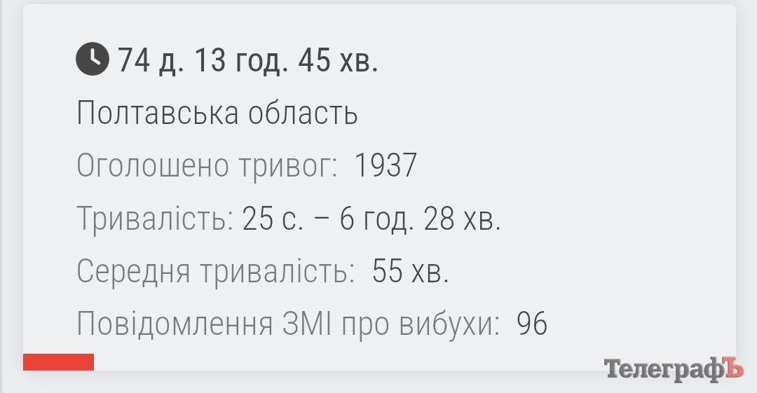 Загалом від початку повномасштабного вторгнення повітряна тривога на Полтавщині тривала 74 дні, 13 годин та 45 хвилин. Середня тривалість повітряних тривог за цей час — 55 хвилин. Вибухи в області лунали 96 разів.