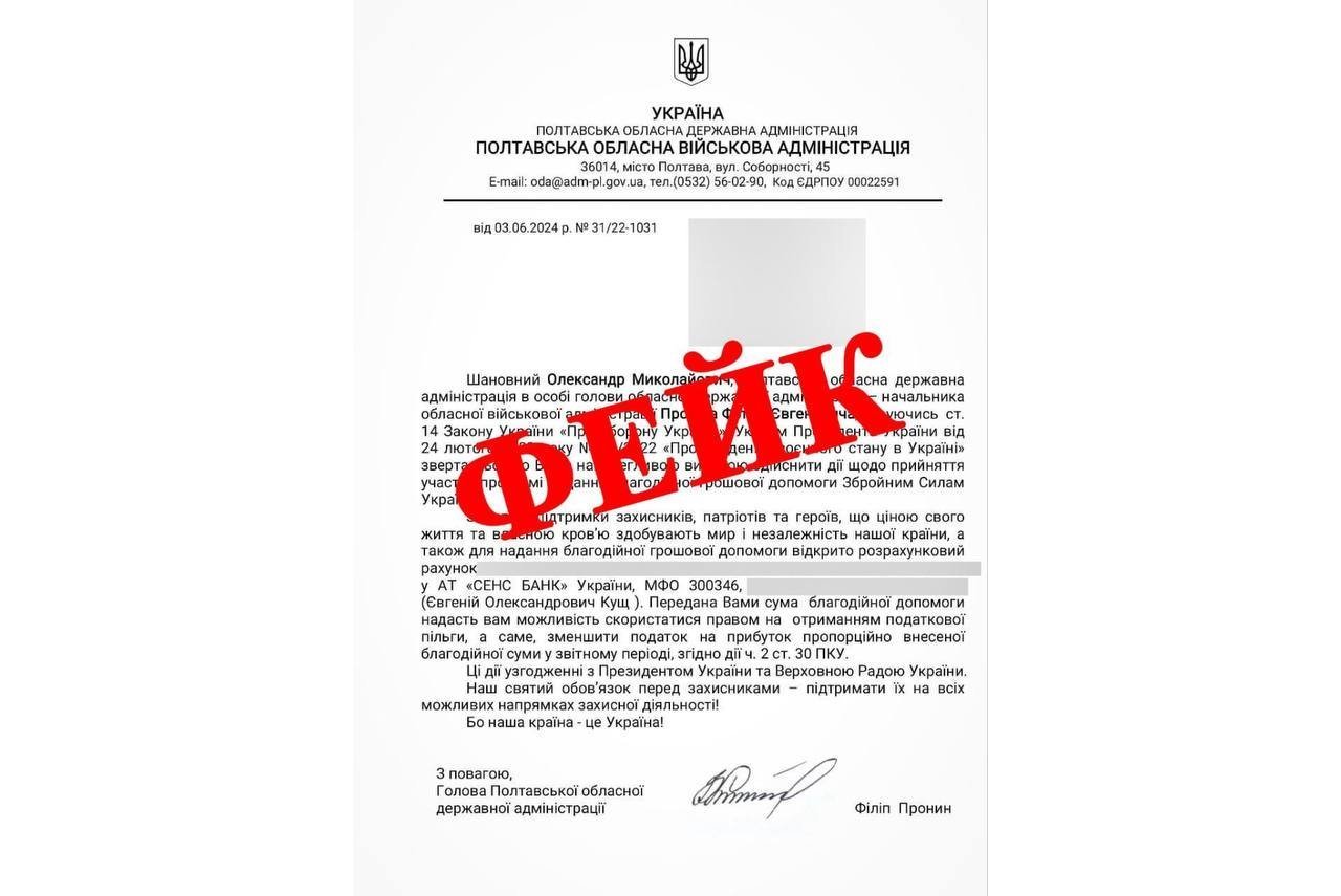 Шахраї розсилають листи від імені начальника Полтавської обласної військової адміністрації Філіпа Проніна з проханням фінансової підтримки захисників. Про це він повідомив на своєму телеграм-каналі 4 червня.