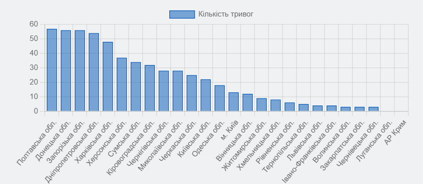 За цей період в області оголошували повітряну тривогу 58 разів. Трохи відстають Донеччина та Запоріжжя — по 56 тривог, Дніпропетровщина — 54, Харківщина — 48. На останньому місці в рейтинзі Волинська, Закарпатська та Чернівецька області — у них повітряна тривога лунала тричі за 10 днів.