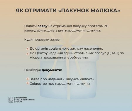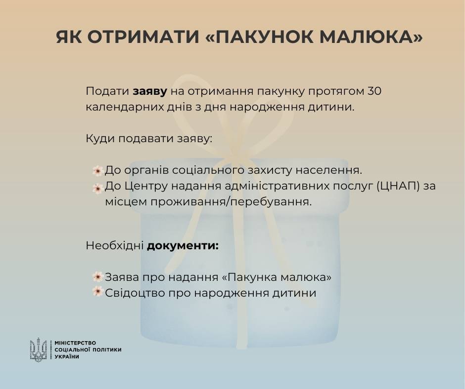 Отримати «пакунок малюка» можна у пологовому будинку, або протягом 30 днів після народження дитини подати заяву та необхідні документи до органів соцзахисту населення за місцем проживання. Для компенсації потрібно звернутися із заявою протягом року.