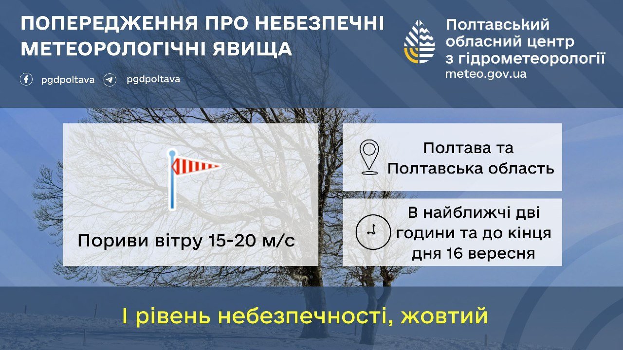 Полтавський обласний центр з гідрометеорології попереджає мешканців області про небезпечні метеорологічні явища. До кінця дня 16 вересня очікуються пориви вітру швидкістю 15-20 м/с. Це відповідає першому рівню небезпеки, позначеному як жовтий.