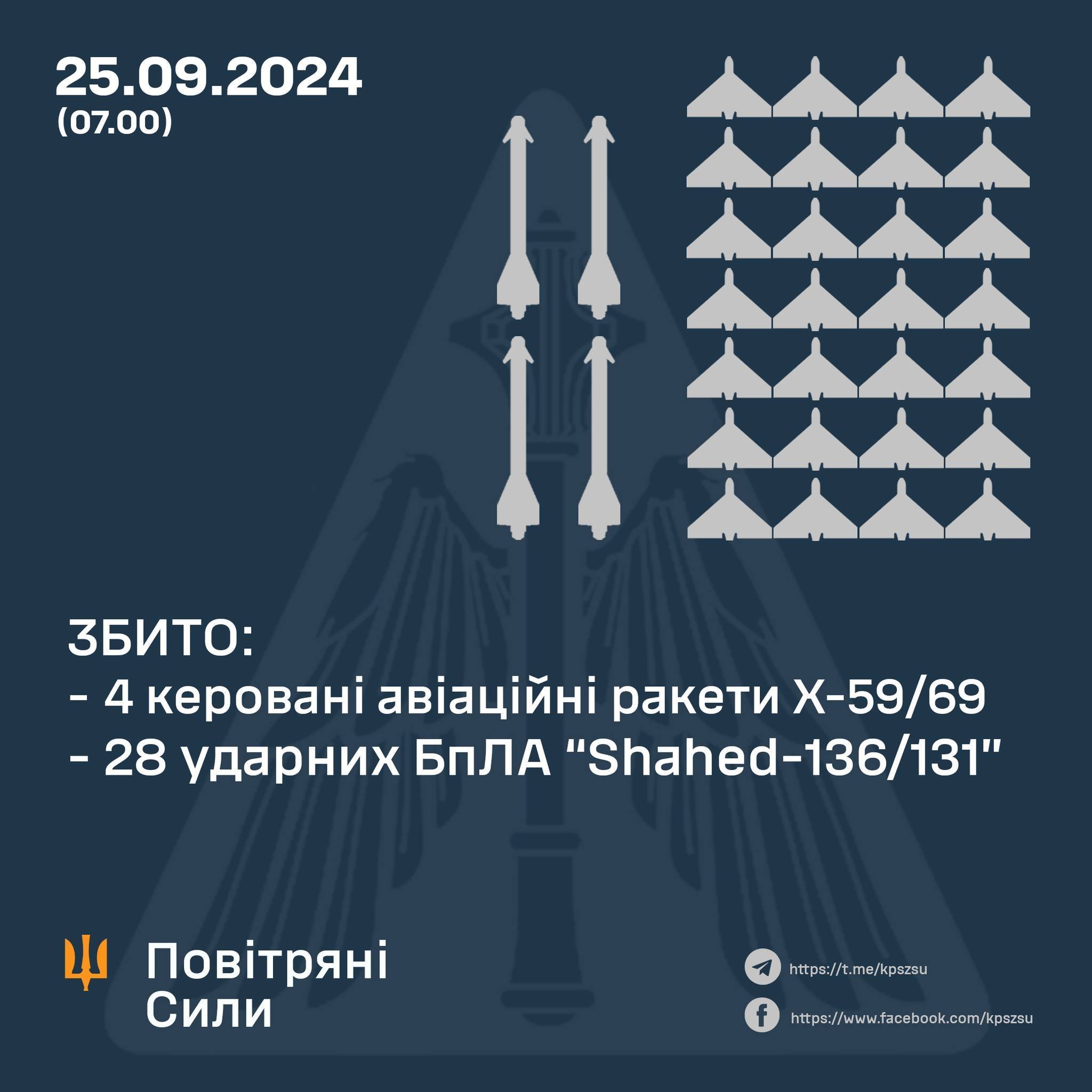 В результаті протиповітряного бою збито 28 ударних БпЛА та 4 керовані авіаційні ракети Х-59/69. Ще 4 ворожих безпілотники були локаційно втрачені противником у кількох регіонах України. Інформація про постраждалих чи руйнування не надходила.