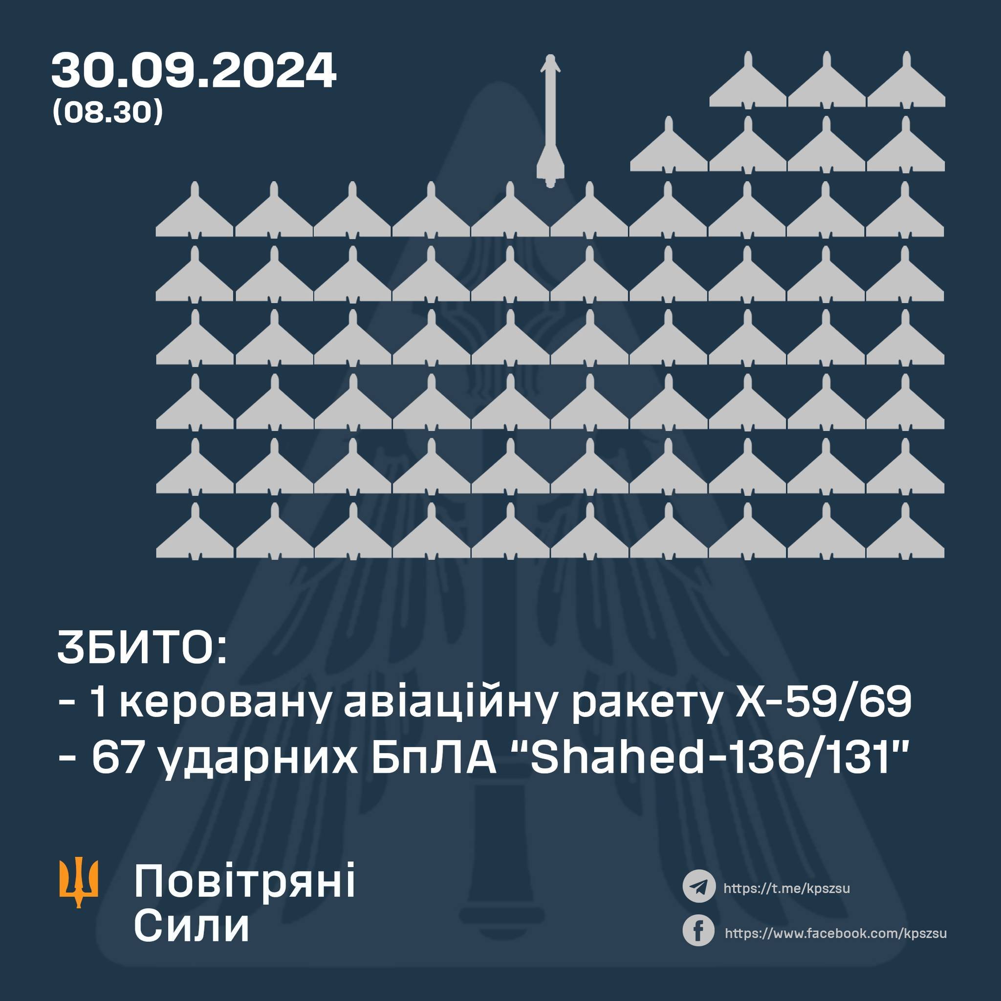 У ніч на 30 вересня росіяни атакували знову Україну 76 засобів повітряного нападу. Про це повідомляє Командування Повітряних Сил ЗСУ.