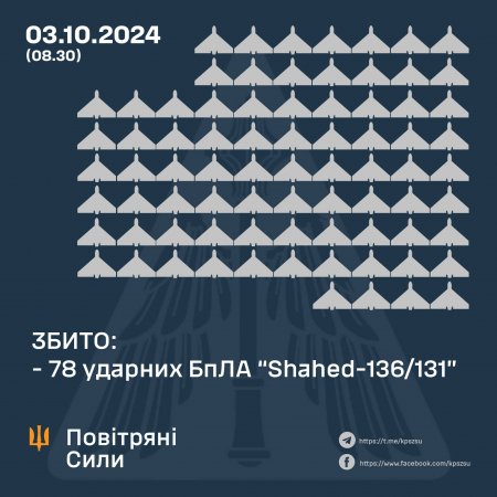 В результаті протиповітряного бою збили 78 російських ударних БпЛА типу Shahed у Київській, Черкаській, Вінницькій, Хмельницькій, Кіровоградській, Житомирській, Полтавській, Чернігівській, Херсонській, Одеській, Харківській, Сумській, Дніпропетровській, Рівненській та Івано-Франківській областях.