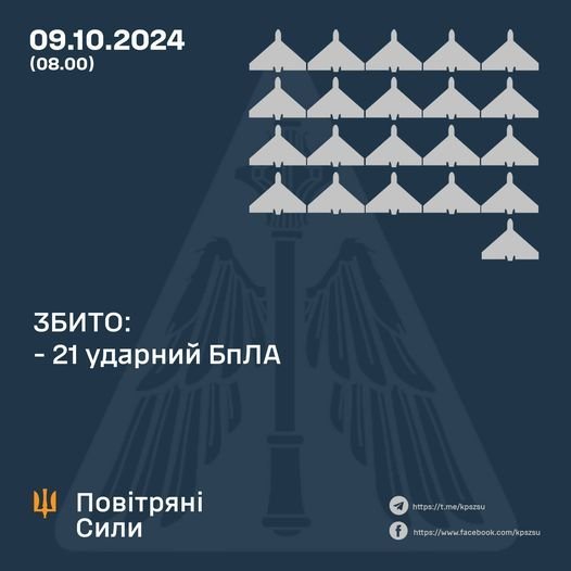 У ніч на 9 жовтня Росія ударила по Полтавщині трьома балістичними ракетами «Іскандер-М/KN-23» із Курської області (РФ), а також 22 ударними БпЛА із Приморсько-Ахтарська (РФ) та мису Чауда (Крим).