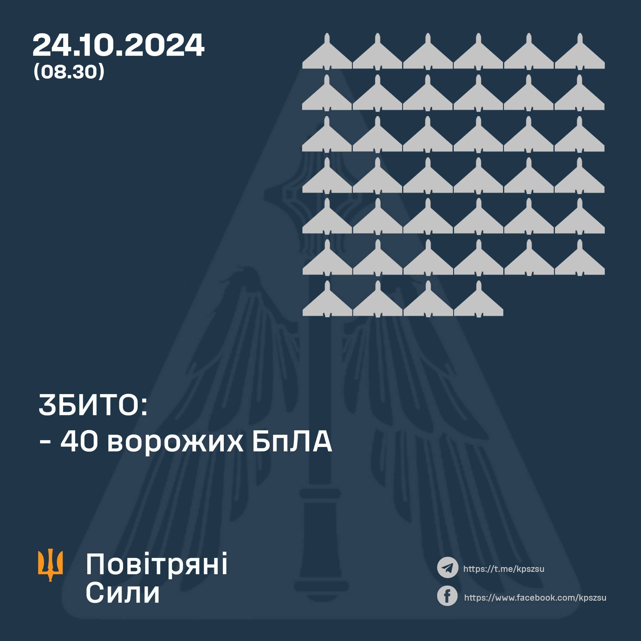Станом на 8.30 підтверджено збиття 40 російських БпЛА в Одеській, Миколаївській, Дніпропетровській, Вінницькій, Житомирській, Хмельницькій, Черкаській, Кіровоградській, Київській, Полтавській та Чернігівській областях.