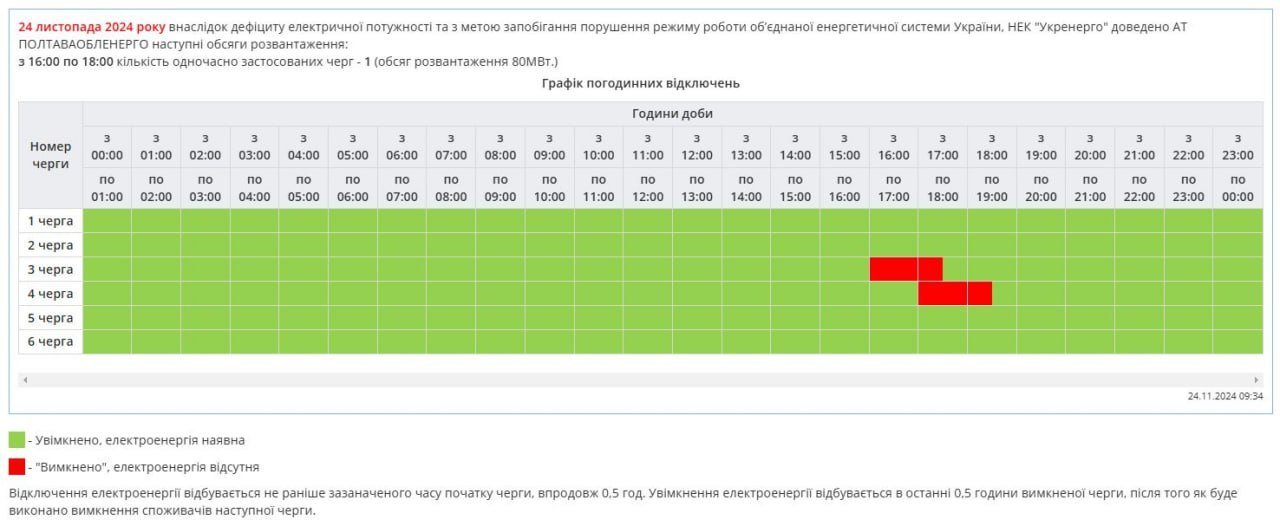 ПАТ «Полтаваобленерго» повідомило про зміни у графіку погодинних відключень світла на сьогодні, 24 листопада.