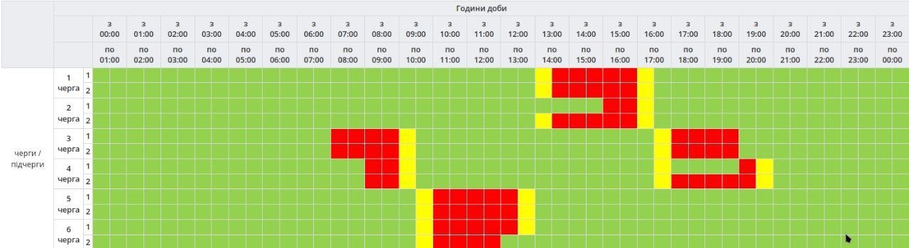 - 7.00 — 8.00 — одна черга відключень;