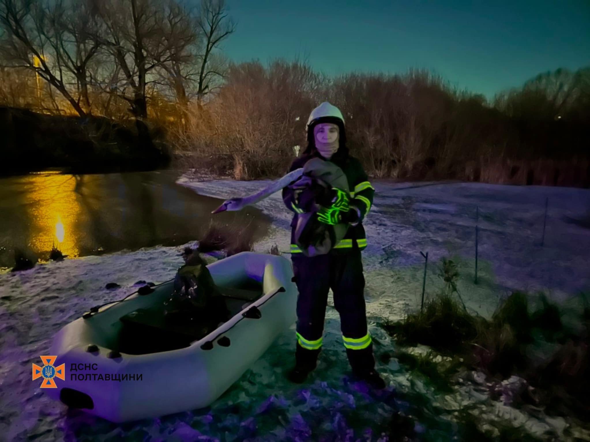 Співробітники 2-ї державної пожежно-рятувальної частини Полтави на човні підплили до птаха, розбили кригу навколо та забрали його на берег.