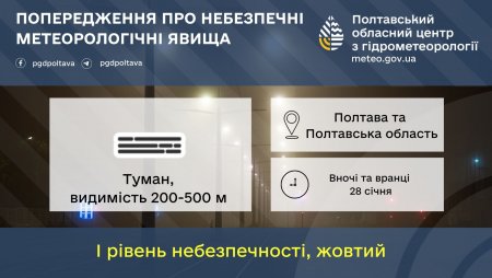 Завтра, 28 січня, уночі та в першій половині дня на Полтавщині синоптики прогнозують туман. Про це інформують у пресслужбі Полтавського обласного гідрометцентру.