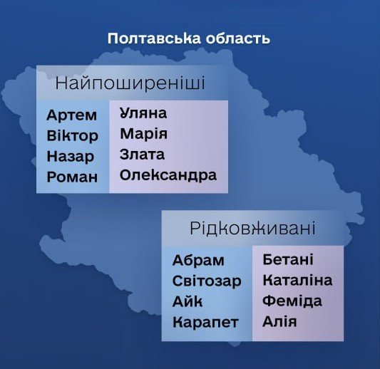 Карапет і Феміда, Артем та Уляна, Світозар та Бетані: у Міністерстві юстиції України назвали перелік найпопулярніших та рідковживаних імен для новонароджених дітей за 2024 рік на Полтавщині.