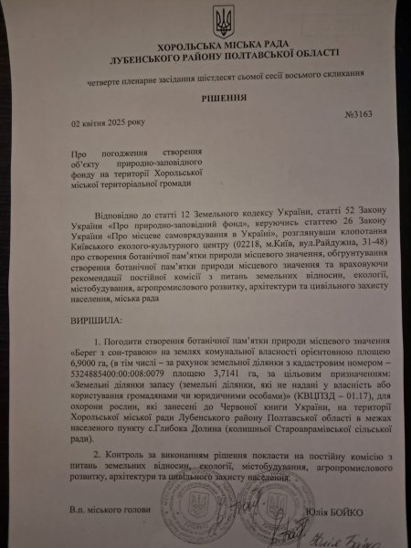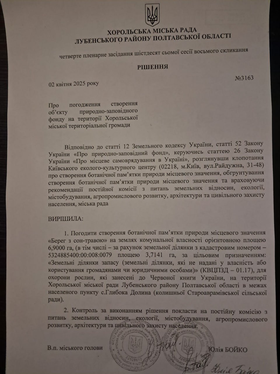 Хорольська міська рада погодила створення ботанічної пам’ятки природи місцевого значення «Берег з сон-травою» на Полтавщині.