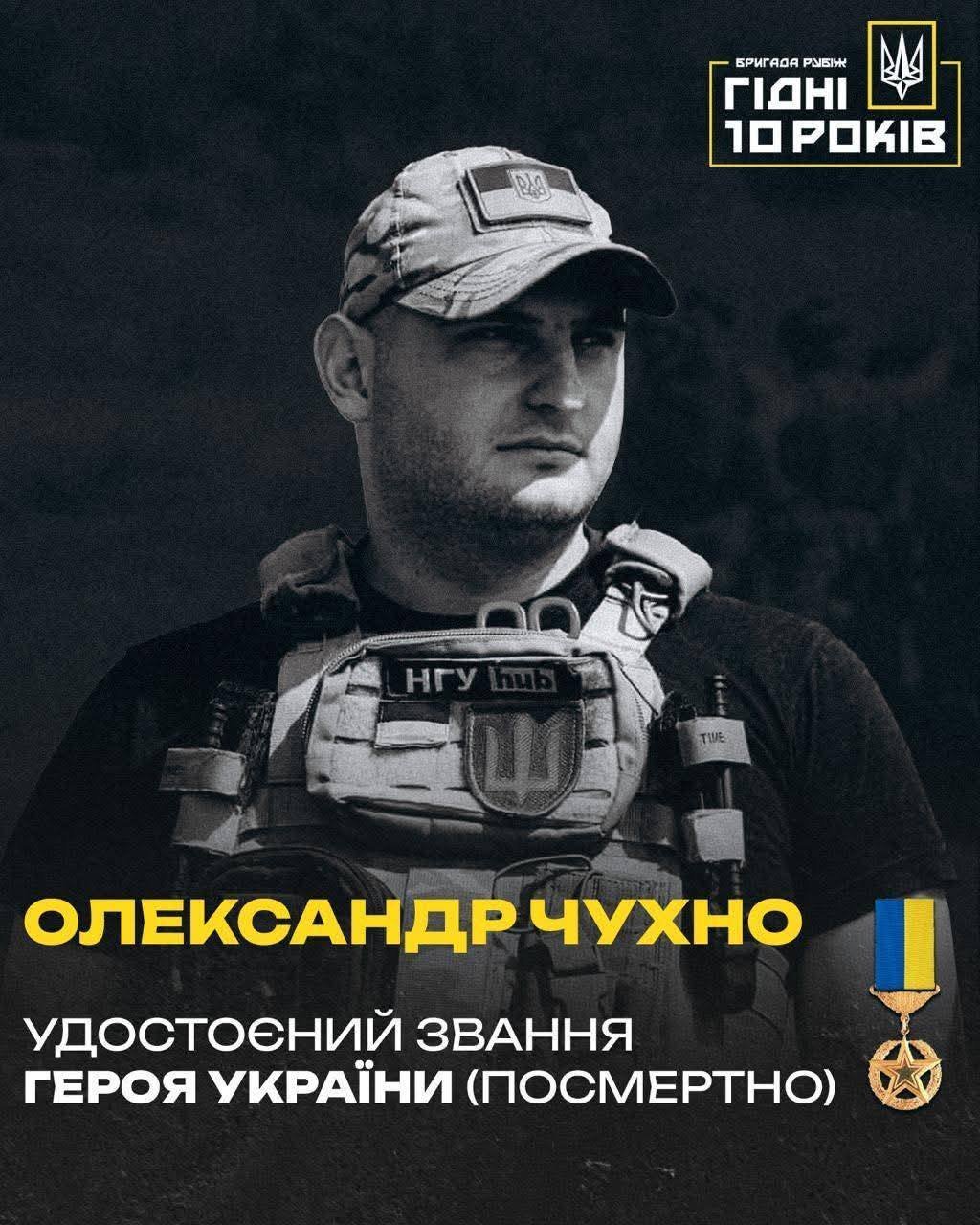 Відповідно до Указу Президента України від 23 травня 2025 року за особисту мужність і героїзм, виявлені у захисті державного суверенітету та територіальної цілісності України, самовіддане служіння Українському народові полеглому лейтенантові Олександру Чухну присвоїли звання Героя України з удостоєнням ордену «Золота Зірка».