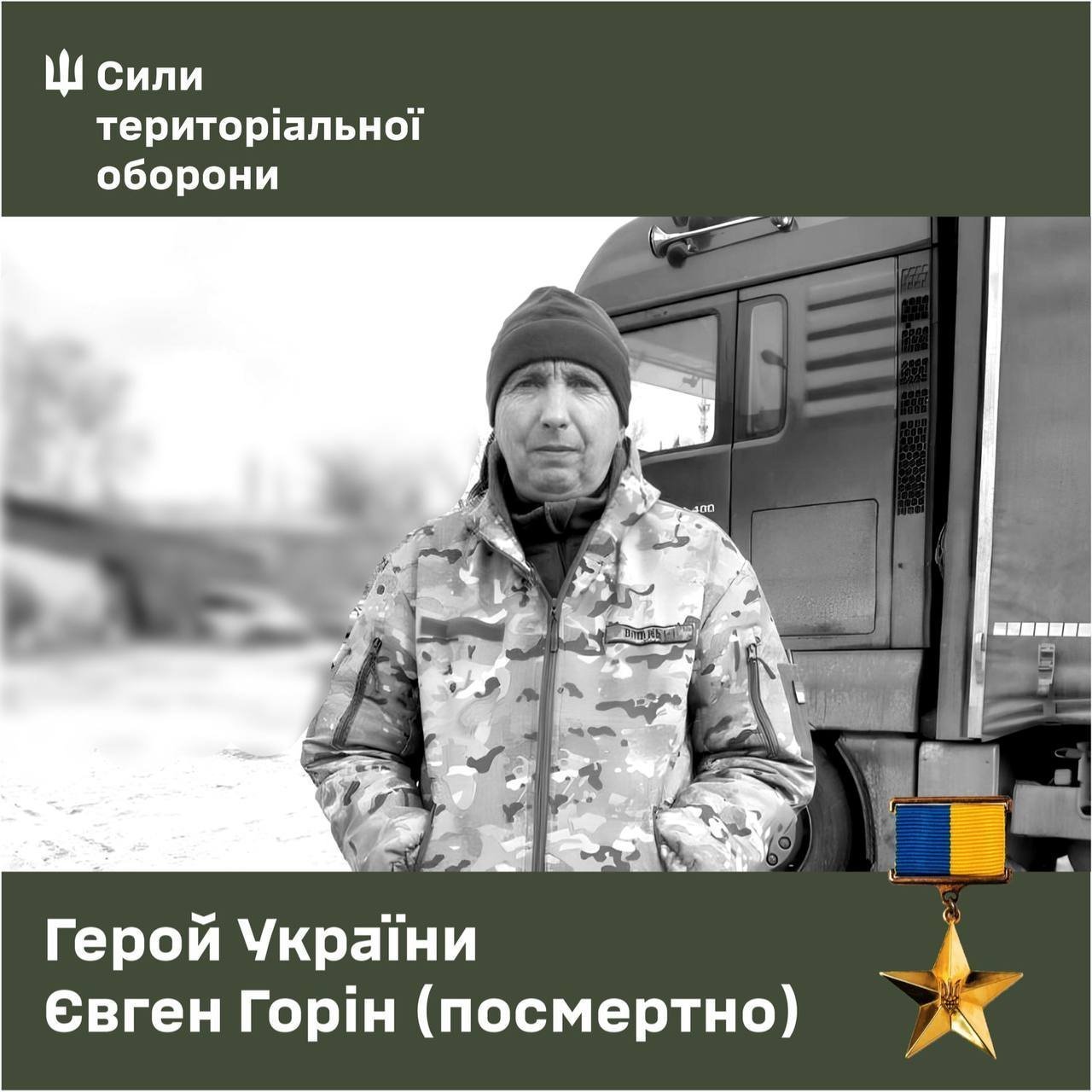 Старший солдат Євген Горін народився 1972 року в Полтаві. Повернувся з-за кордону, щоб захищати Батьківщину. Служив снайпером у складі роти вогневої підтримки. На Бахмутському напрямку знищив понад 20 окупантів. Під час одного зі штурмів захопив ворожу радіостанцію, що дозволило перехопити дані про атаку. 15 березня 2023 року загинув, прикривши своїм тілом побратимів під час артобстрілу. У нього залишилися дружина та четверо дітей. Звання Героя України з удостоєнням ордену «Золота Зірка» присвоїли полеглому захиснику цьогоріч у січні.
