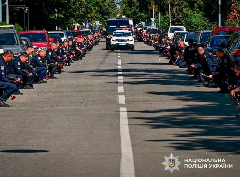 У центрі міста утворили коридор шани — місцеві жителі та поліцейські стояли обабіч дороги з похиленими головами, ставши на одне коліно.