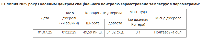 Уночі 1 липня поблизу села Карпусі, що в Полтавському районі, стався землетрус магнітудою 3,1 за шкалою Ріхтера. Про це повідомили в Головному центрі спеціального контролю.
