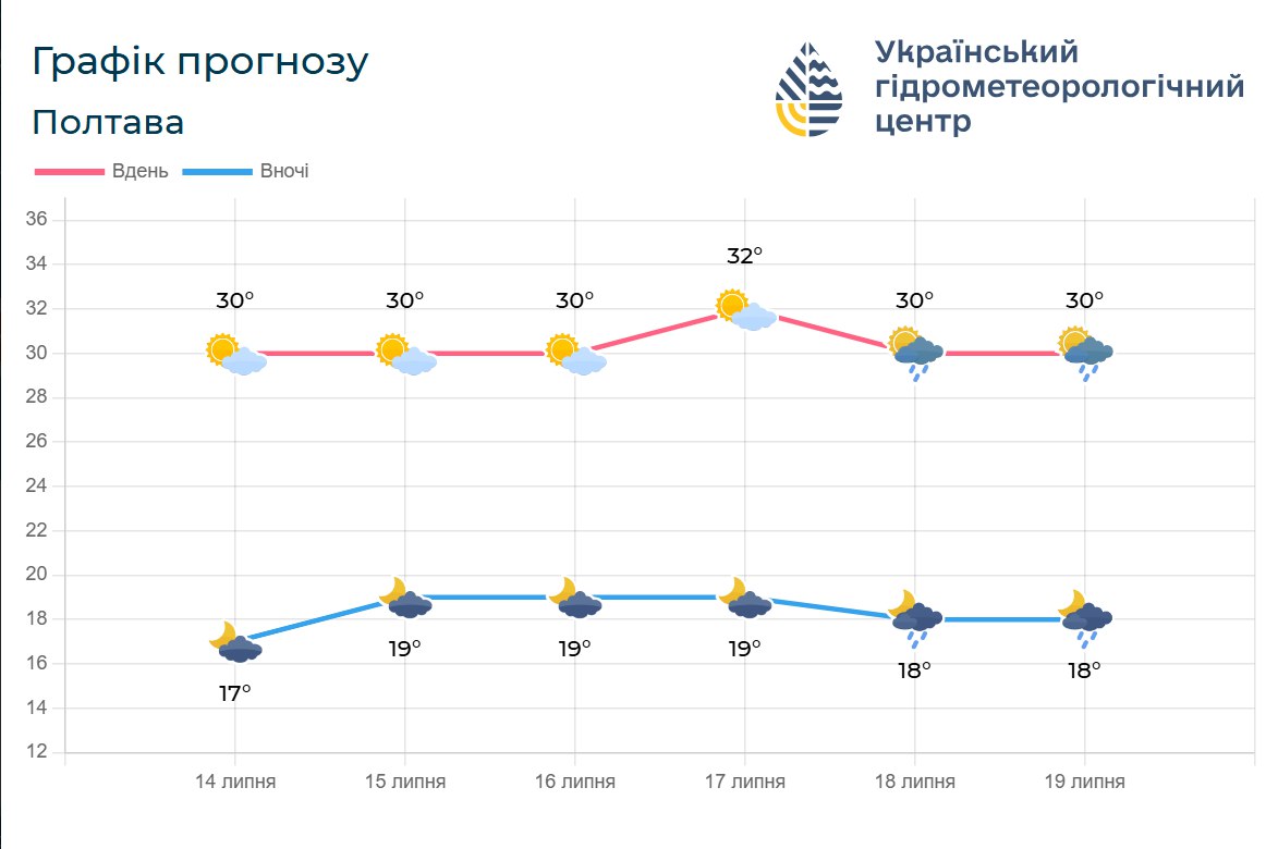 Цього тижня на Полтавщині очікується спекотна та переважно суха погода. За даними обласного гідрометеоцентру, денна температура сягатиме +27…+32°C, а вночі буде тепло — від +16 до +21°C.