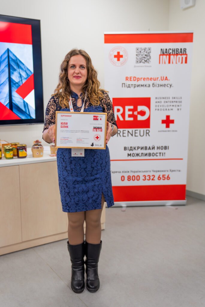 Юлія розповідає, що від представництва Червоного Христа в Україні знайшла можливість для вимушених переселенців, які хочуть займатися бізнесом, пройти навчання й отримати грант. Не маючи знань, але маючи велике бажання, вирішила спробувати.