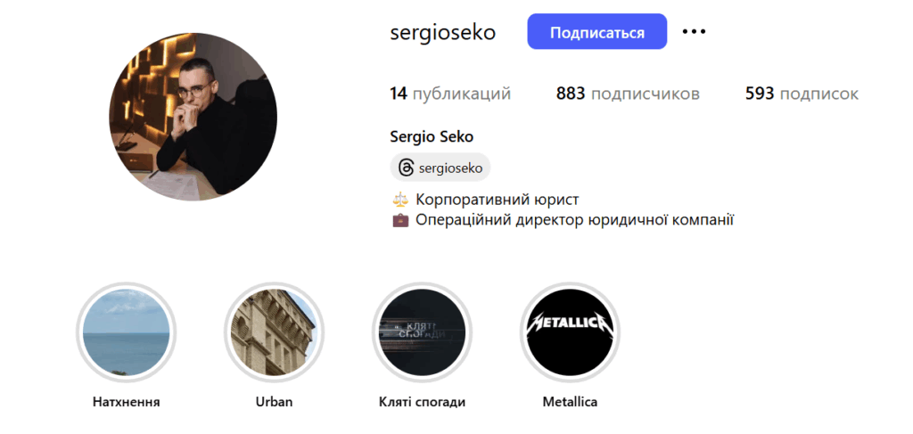 На сайті ми роздивились співробітників компанії. Серед них зустріли корпоративного юриста Сергія. На диво, його фото ідентичне користувачу, що назває себе Сергієм Секо у соцмережах та постить фото на лонгборді з Ірпеню. Судячи з цього профілю «номер два» — творча особистість, автор музики та слів до синглів, операційний директор юридичної компанії.