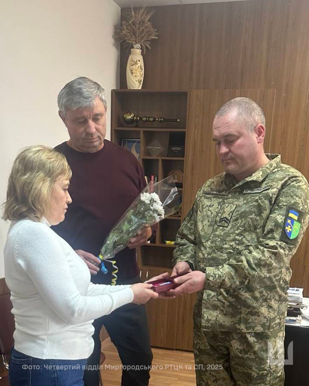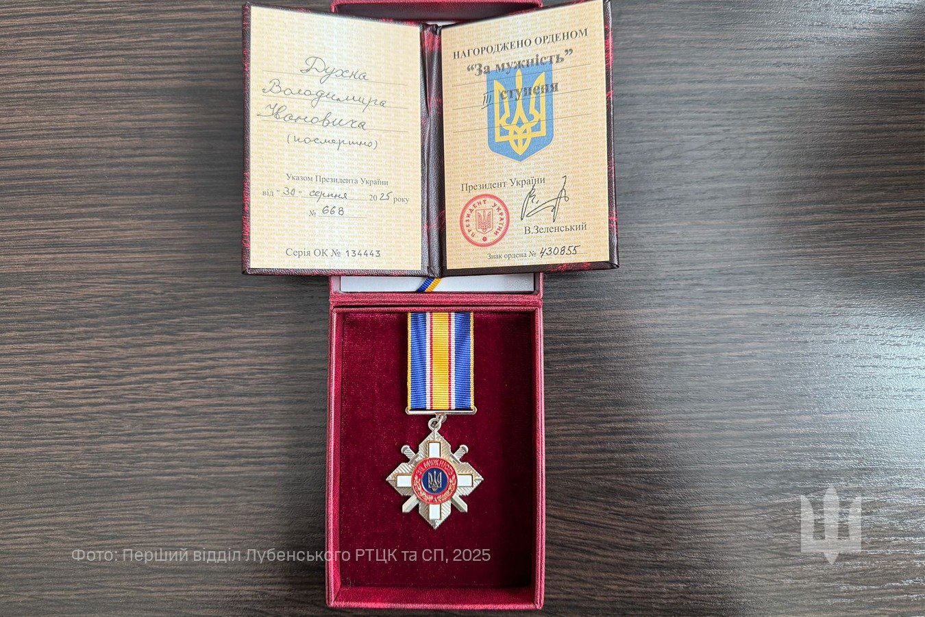 У Хорольській громаді представники Лубенського районного ТЦК та СП разом із чиновниками міськради передали орден «За мужність» ІІІ ступеня, який посмертно присвоїли старшому солдату Володимирові Духну, його дружині.