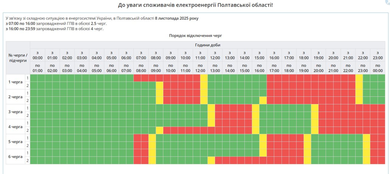 У «Полтаваобленерго» повідомили про зміну режиму електропостачання через складну ситуацію в енергосистемі України. 8 листопада 2025 року в області запроваджено: