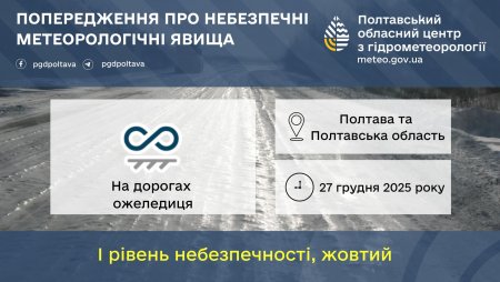 Полтавський обласний центр з гідрометеорології попередив про небезпечні метеорологічні явища, які очікуються завтра. В суботу, 27 грудня на дорогах Полтавщини прогнозують ожеледицю. Рівень небезпеки жовтий.