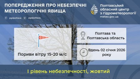 Синоптики Полтавського гідрометцентру прогнозують сильні вітер вдень 2-го січня. Пориви сягатимуть 15-20 м/с. Рівень небезпеки жовтий.