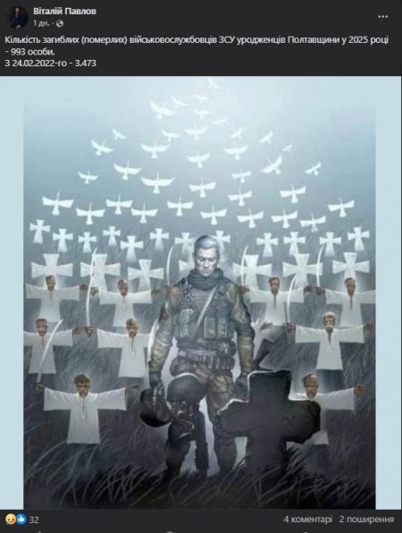Упродовж 2025 року загинули 993 військовослужбовці Збройних сил України — уродженці Полтавської області. Про це 2 січня повідомив у фейсбуці відповідальний секретар комісії з питань найменування та перейменування елементів міського середовища та інфраструктури, увічнення пам’яті осіб та подій при виконкомі Полтавської міської ради Віталій Павлов.