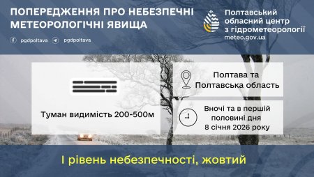 Синоптики попереджають, що вночі та в першій половині дня 8 січня у регіоні збережеться туман, через який видимість на дорогах знизиться до 200–500 метрів. Через це оголошено І рівень небезпечності–жовтий. Про це повідомили в Полтавському обласному гідрометцентрі.