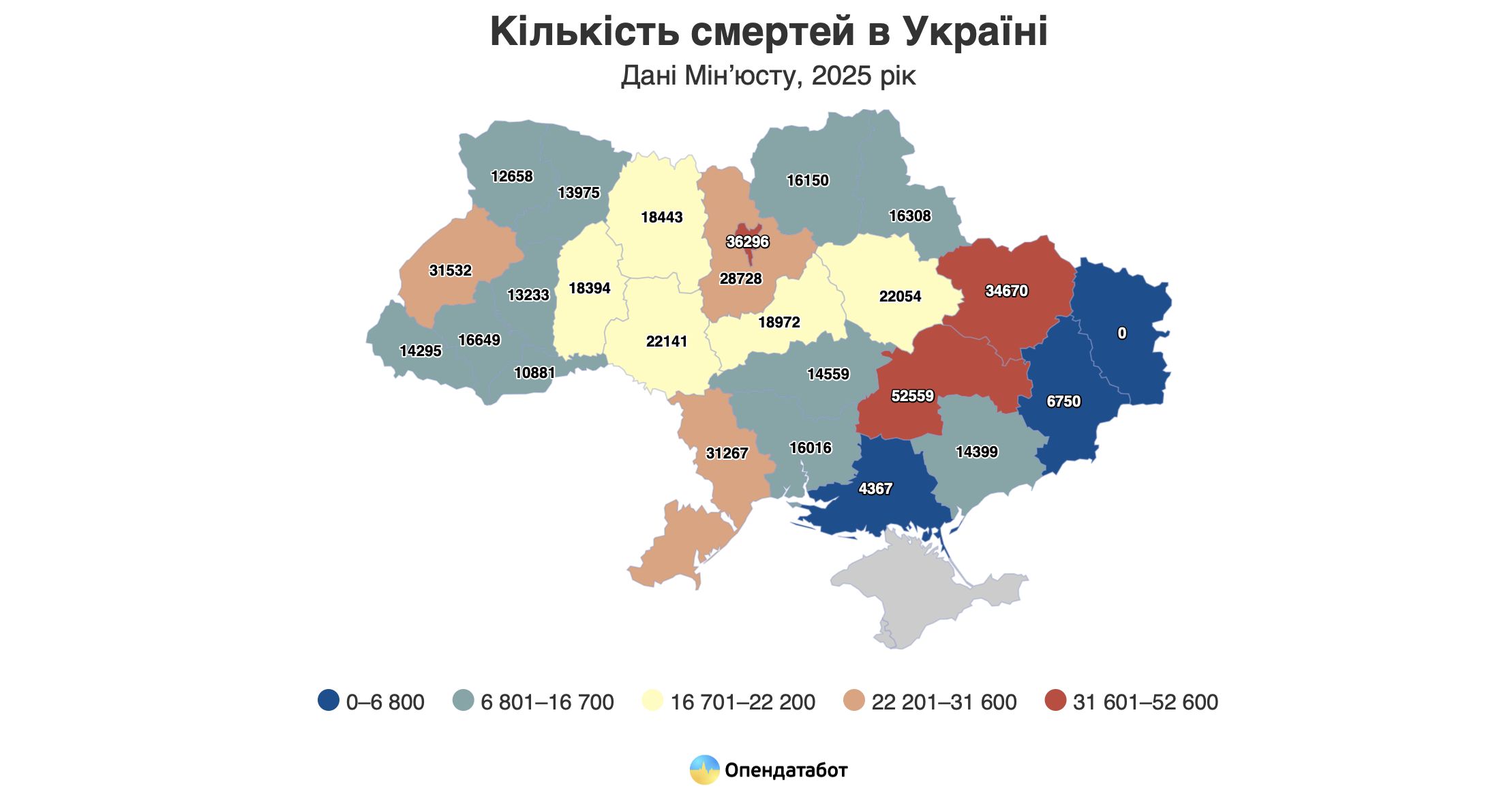 За даними Міністерства юстиції України, торік в Україні народилося близько 169 тисяч дітей, тоді як кількість померлих перевищила 485 тисяч осіб. Таким чином, у середньому на одного новонародженого припадало троє померлих. Про це повідомляє Опендатабот.