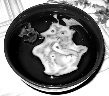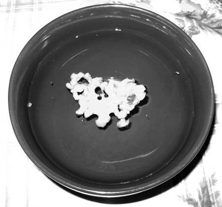 Специально для этого гадания на будущее я припасла восковую (не парафиновую!) свечку. Тру ее на терке. Потом берем большую ложку (которую не жалко), растапливаем по очереди воск на открытом огне (подойдет и обычная кухонная конфорка). Р-раз: резким смелым движением нужно вылить воск в миску с холодной водой. Главное, разглядеть и истолковать, что получится. Делать это можно и самим. Кстати, в психологии недаром существует тест, так называемые «двойные фигуры». Проверяется ваше восприятие мира. Так, можно увидеть на картинке молодую девушку, а можно – старушку. Воск, по сути дела, та же штука. Мы увидели только хорошее.