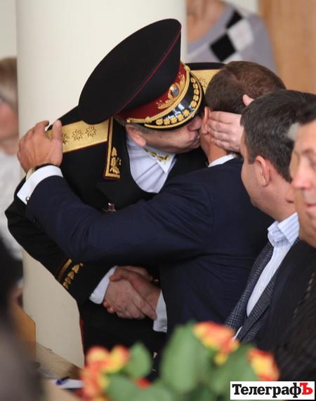Два колишніх комсомольці-добровольці – екс-віце-мер Онищенко та голова райради Коваленко (зліва) – цілуються в найкращих традиціях буремної молодості – так, як вчив посадовців цілуватися темнобровий вождь радянського народу Леонід Ілліч Брежнєв: міцно і пафосно.