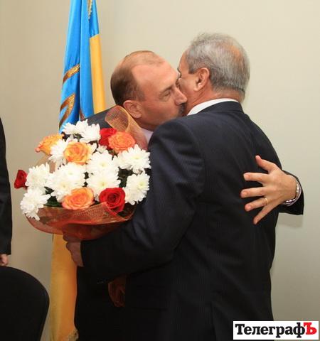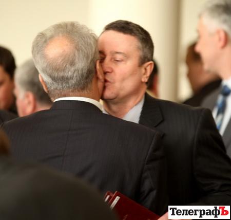 Старший товариш – голова Автозаводської райради пан Коваленко – коректно цілує в свіжу щічку молодого товариша – народного депутата пана Надошу (зліва).