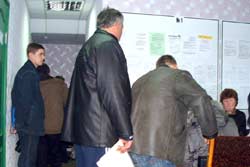 На місці ми були приблизно об 11.00, вирішили, що до цього часу черга розійдеться. Але прогадали… Потовклися біля інформаційних стендів, намагаючись віднайти перелік документів, які майбутньому підприємцю необхідно принести на реєстрацію. Не знайшли… На стендах багато інформації, але узагальненого переліку не вивісили…