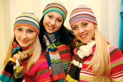 Вязаные шапочки никто в этом сезоне не отменил. Мы предлагаем «исполосовать» их всеми цветами радуги. При этом задумываться об удачном сочетании цветов не стоит. Чем сумасброднее палитра – тем круче и веселее. Ансамбль дополнят «жутко» полосатые шарфики и перчатки. Например, шапка, шарфик и перчатки Beneton из шерсти и котона «потянули» на З65 гривен.
