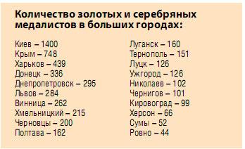 В Харькове золотые медали получили 339 выпускников. В прошлом году их было в полтора раза меньше – 197. Черновцы в этом году гордятся 158 золотыми медалистами. В прошлом их было почти вдвое меньше – 82. Львов – 284 против 150. Волынь – 709 против 679.