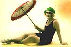 В 20-х годах XX века появились более облегченные варианты купальников: длинный полотняный халат со сборками, стянутый прямо у шеи, в котором дама превращалась в шар, покачивающийся на поверхности воды. Или скромные туники, стянутые на талии поясом, и панталоны ниже колен. Те, кто был смелее, купались без обуви. Однако многие дамы сопротивлялись модным нововведениям – о загаре не могло быть и речи. Это считалось дурным тоном и уделом плебеев, а бледная, не загорелая кожа, наоборот, – признаком аристократизма.
