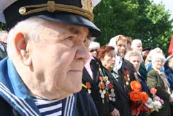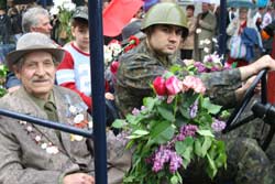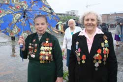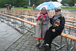 Хоча метеорологи заздалегідь попереджували про можливі опади, організатори свята – міська влада – до них не підготувалися. Лавки для ветеранів на площі Перемоги геть вимокли під дощем. Жоден ветеран не ризикнув на них сісти. Лише главстаршина Колесник (на фото разом з дружиною) сказав, що “водички не боїться”.