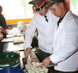Розливати бойові 100 грамів – справа відповідальна. Боєць виконує її під невсипущим оком чергового офіцера. “100 грамів” забезпечила торгова марка “Олімп”. Солдатську кашу зварили – як завжди – ракетники.