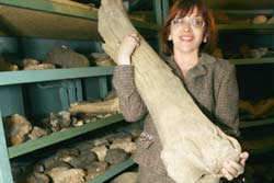 Пані тримає в руках кісточку мамонту. У пані така вимучена посмішка тому, що кісточка страшенно важка – мамонт важка звірюга.