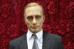 Главный телегерой – Владимир Путин. На изготовление подобной фигуры уходит от двух до шести месяцев. Каждый волос (натуральный) вживляет в воск специалист-постижёр. А волос этих от 40 до 80 тысяч. Глазной протез для персонажа стоит около тысячи долларов, а изготовление всей фигуры обходится мастерской в 10 тысяч долларов.