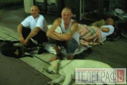 Эти трое парней – новое поколение русских, живущих в Ницце. С двумя своими собаками они живут на ступеньках нежилого подъезда неподалеку от фешенебельного отеля «Негреско». По утрам парни грузят пожитки в тележку, когда-то украденную в супермаркете, и исчезают – чтоб не мозолить глаза приличной публике. Вечером возвращаются на насиженное место. Живут милостыней. Главный кормилец – Толстый (флегматичный, хорошо упитанный белый лабрадор, на фото справа). Толстый выглядит, как приличная собака и очень нравится французам. Именно ему на собачьи харчи они и подают мелочь. Вот так на заработки Толстого живет вся компания. Второй пес – Шпала – очень расстраивает французскую публику. Он худой и грустный. Французы ругают русских, что те не кормят собаку. Русские огрызаются, и объясняют, что Шпала «не жрет, потому что тоскует по хозяину!» А хозяин Шпалы появится нескоро – товарищ сел на два года во французскую тюрьму. Шпалу после этого забрали в муниципальный собачий приют, откуда наши три товарища и выкупили пса – чтобы он, значит, жил на свободе и среди своих. А то среди «ихних» французских собак он и русский скоро забудет.