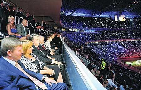 Вот, правда, не всех их с одобрением встречали болельщики. Так, Виктора Ющенко во время выступления трибуны практически освистали, а Виктора Януковича и Рината Ахметова встречали овациями и стоя. Все три политика и спикер парламента Владимир Литвин на открытии стадиона сидели в VIP-ложе. А вот Юлия Тимошенко сидела среди депутатов на спецтрибуне. Среди обычных болельщиков сидел Арсений Яценюк.