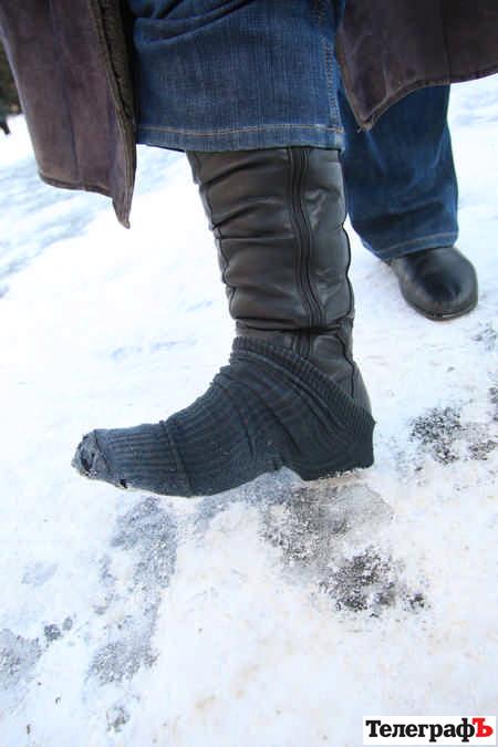 Виходжу на слизьку-слизьку доріжку. З одного боку – добре втоптаний сніг, на якому от-от поїдеш, з іншого – льодовий панцир. Витягаю з кишені старі шкарпетки – вони мають врятувати мене від падіння. Народний рецепт гласить: носки потрібно натягнути на чоботи. Дається це не просто – вони ніяк не бажають налізати на п’ятки. Хвилин через п’ять носки вже вдягнені на чоботи. По втоптаному снігу в такому прикиді йти набагато легше, не ковзаєш. А от на льоду цей «винахід» зовсім не допомагає. Такий засіб, звичайно, не підійде модницям. Бо коли я спробувала прогулятись у шкарпетках, перехожі кидали на мене здивовані погляди і посміхались. Хіба що поверх чобіт одягнути не діряві, а дуже гламурні носки. Ще один мінус – тканина швидко псується.