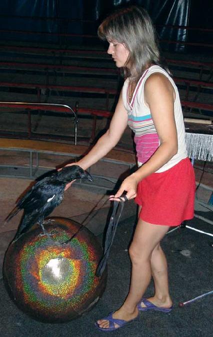 – Они очень реагирут на смену обстановки, особенно если что-то не так вверху. Тут для них была новая трапеция. И вчера был полный завал: все вороны смотрели туда и не хотели работать… Сейчас я принесу Воркушу, он умница, все сделает.